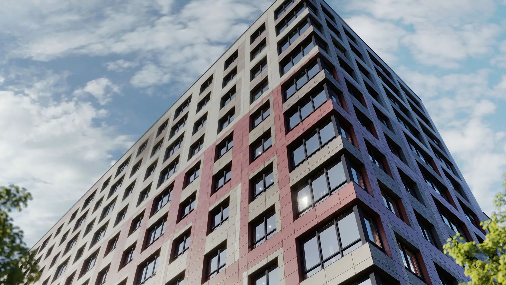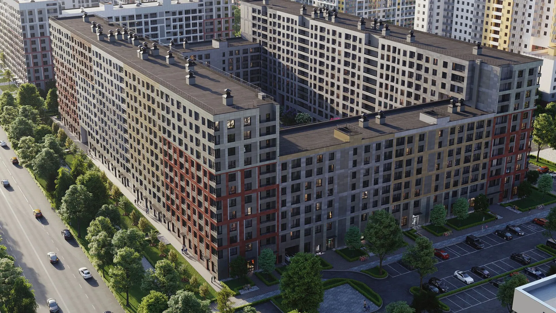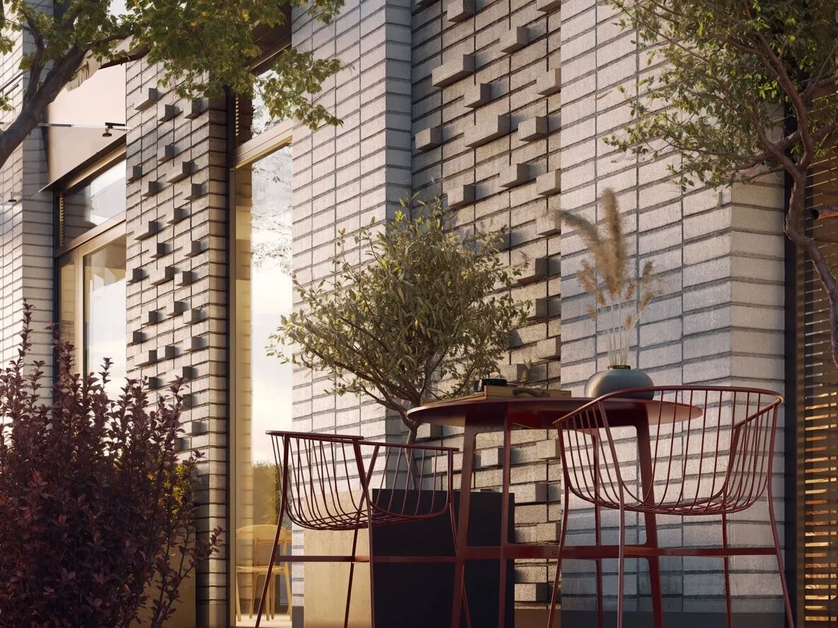 Фасады выполнены с использованием нескольких видов фактурного кирпича — от гладкого тёмного до шероховатого светлого, что придаёт им глубину и текстуру. Ключевые элементы — французские балконы и оконные линии — подчеркнуты вставками из матового золота. Панорамные окна обеспечивают виды на город и благоустроенный двор, исключая обзор на квартиры соседей напротив. В вечернее время фасады и придомовая территория эффектно подсвечиваются.