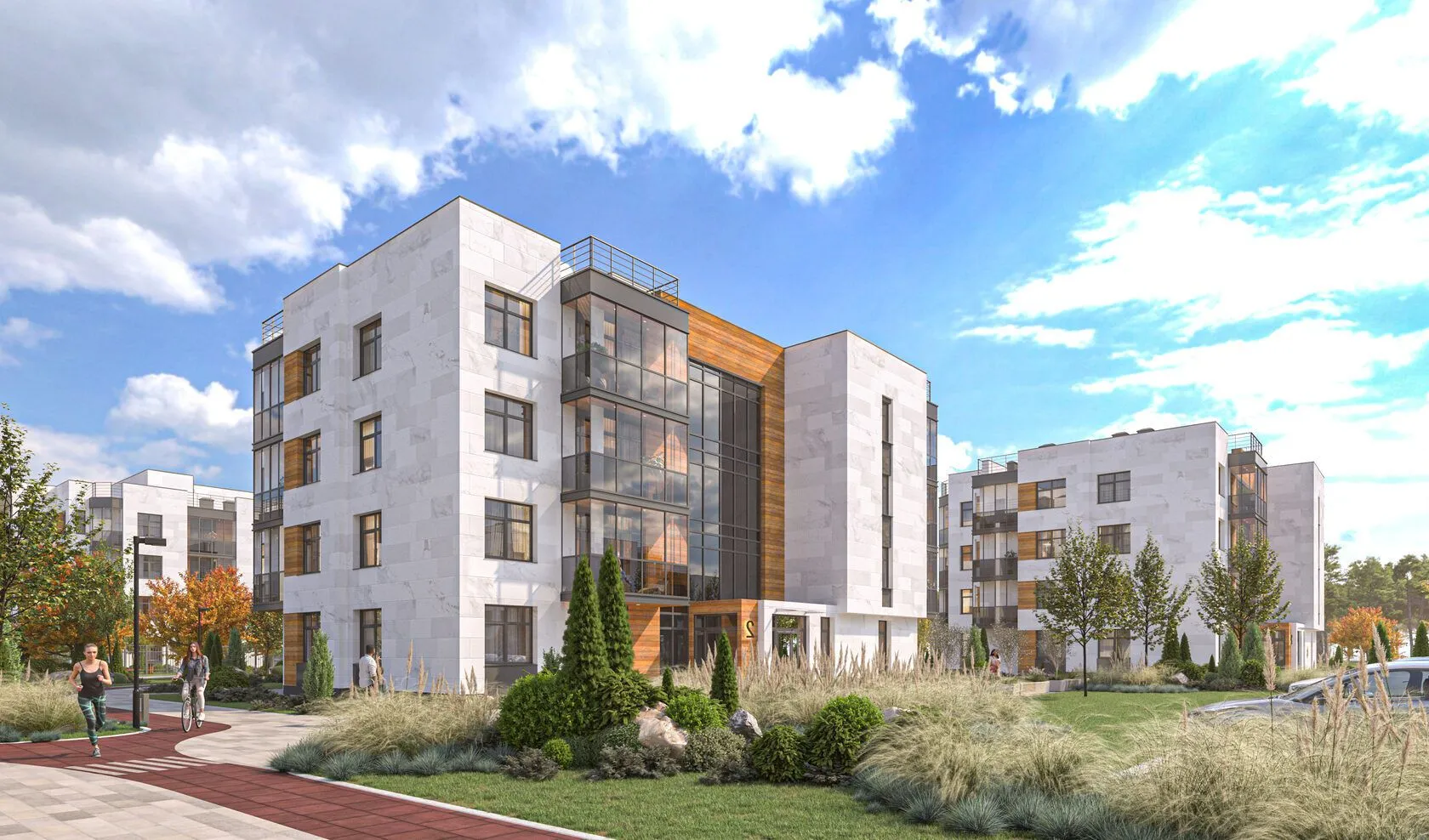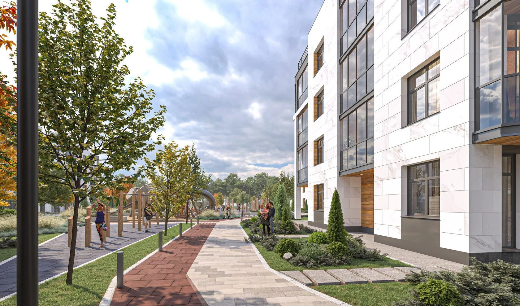 На территории комплекса запланировано масштабное благоустройство: большая лаунж-зона с открытым бассейном и шезлонгами, детская и спортивная площадки, декоративная брусчатка для прогулок, велосипедные и беговые дорожки, посадка лиственных и хвойных деревьев, беседки и скамьи. Двор закрыт от машин.