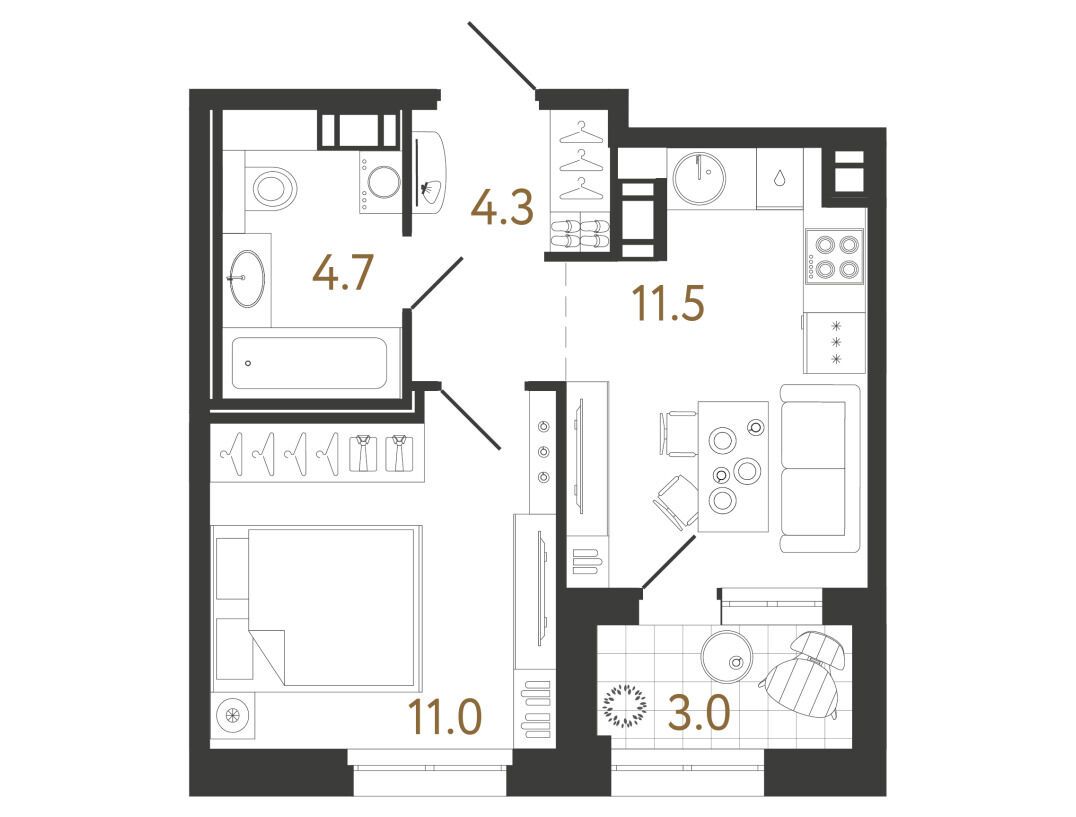 1-комн. квартира, 31.50 м²