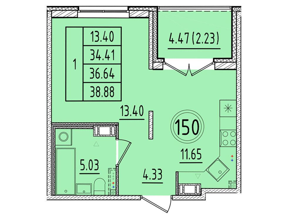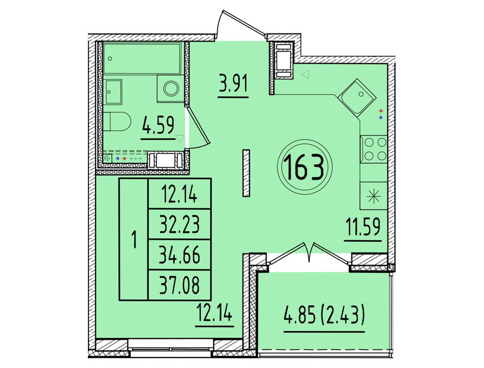 1-комнатная, 35.08 м²