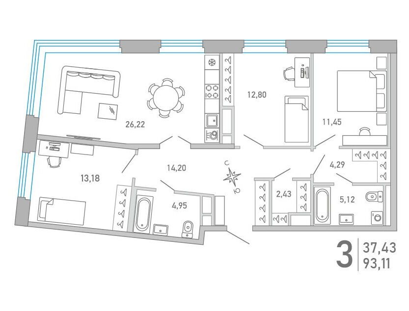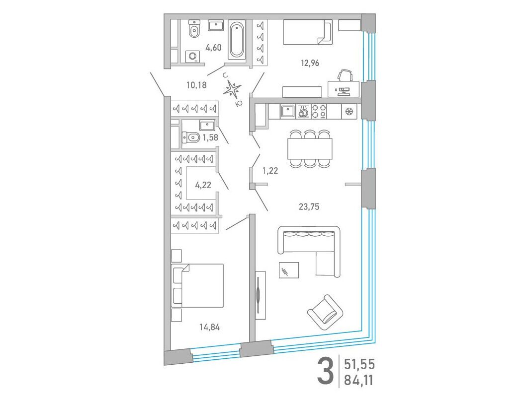 3-комнатная квартира, 91.83 м², 3 из 10 эт.