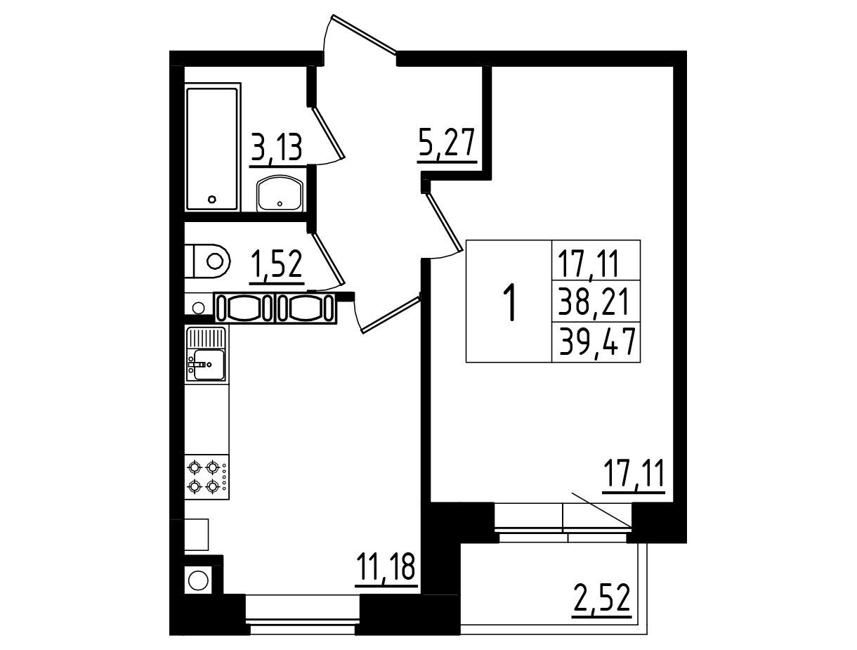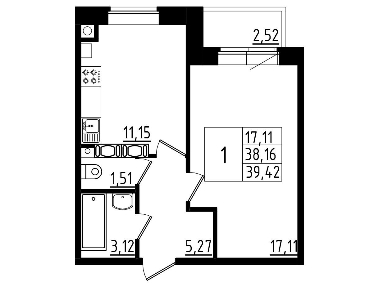 1-комнатная, 38.19 м²