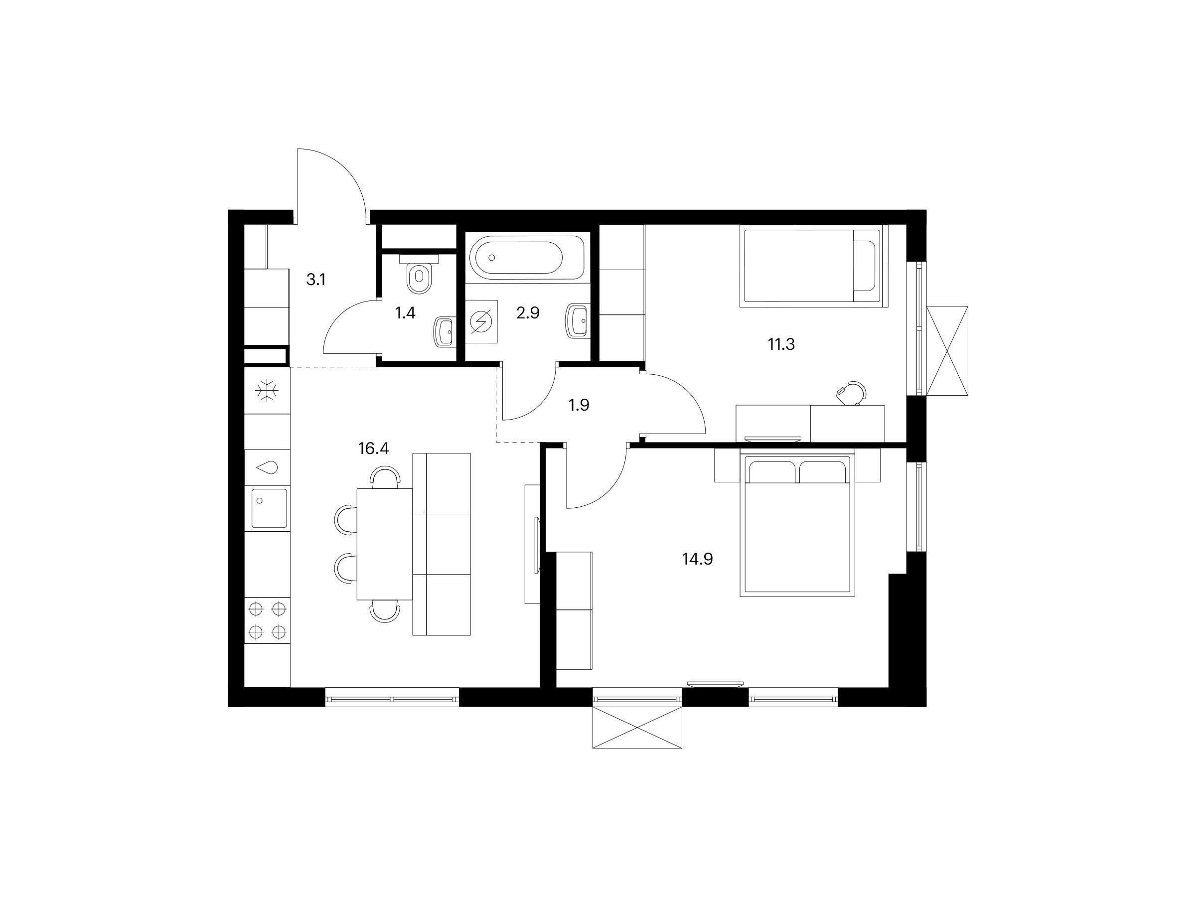 2-комнатная, 51.90 м²