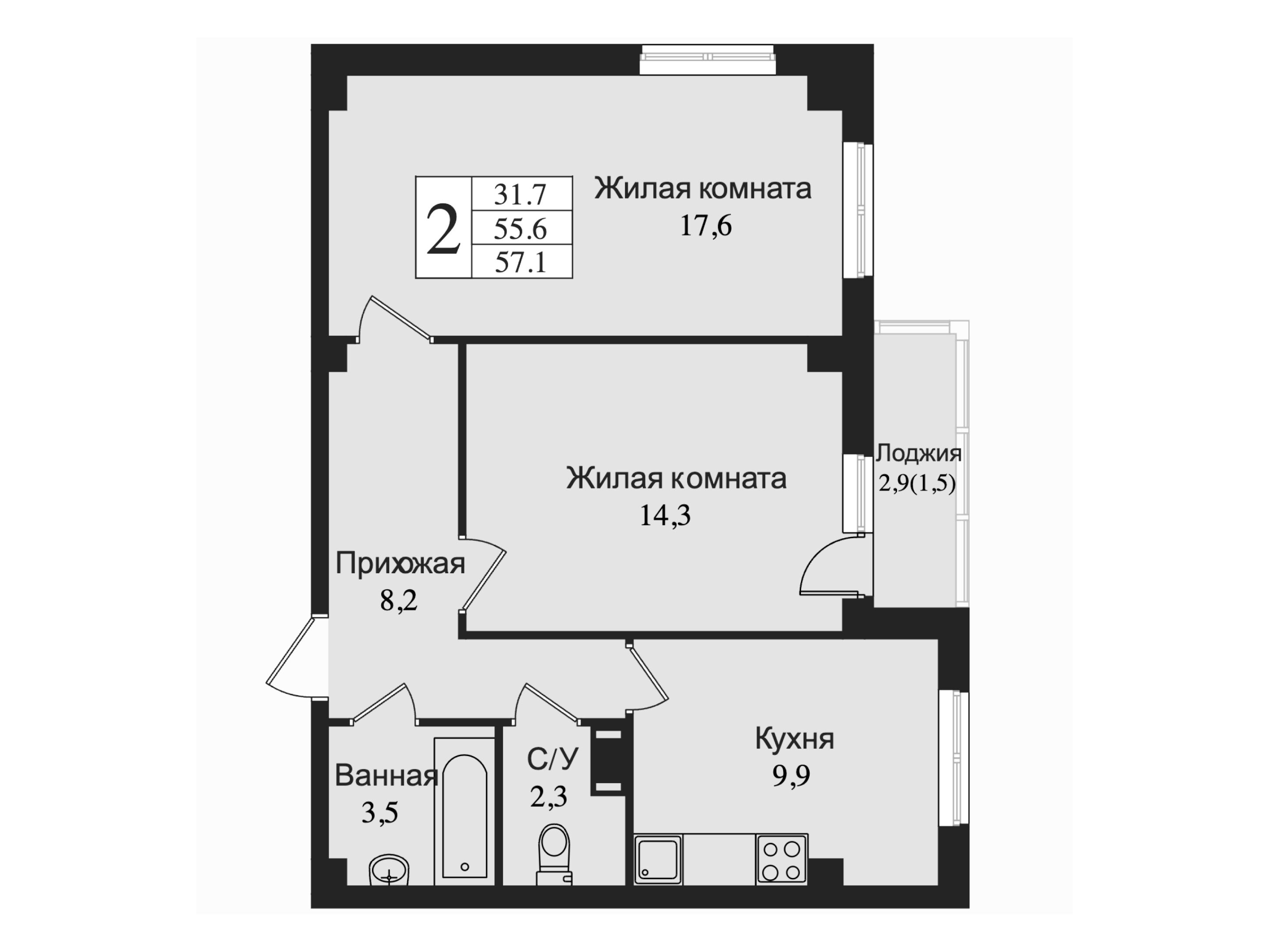 2-комнатная, 58.70 м²
