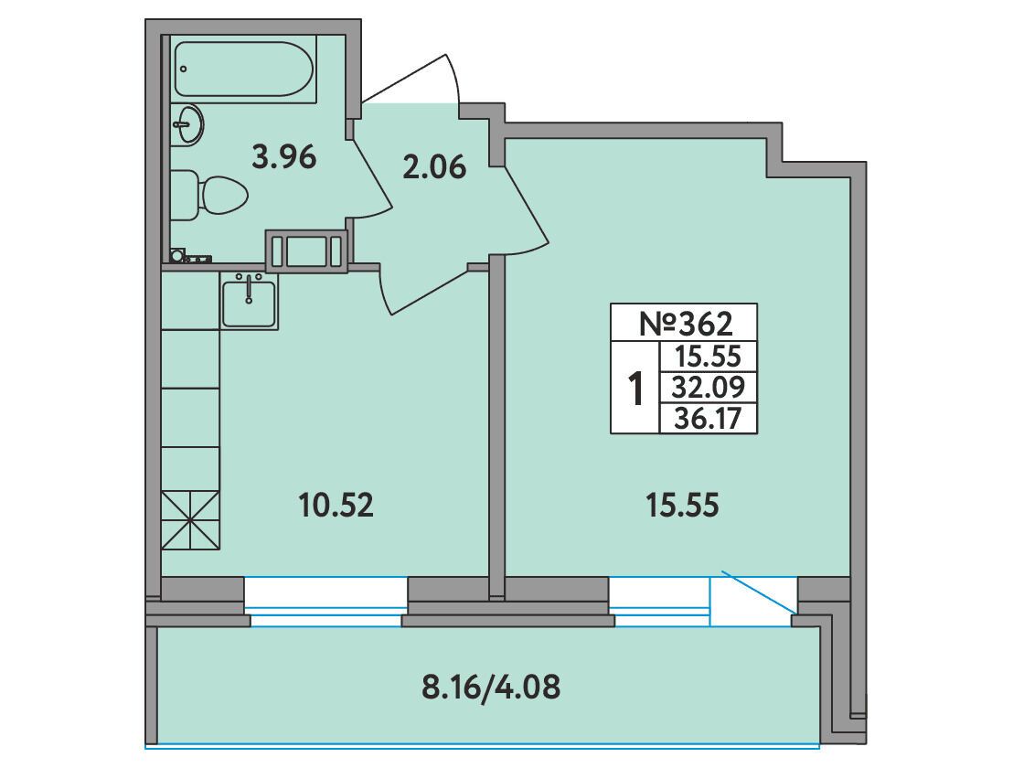 1-комнатная, 32.70 м²