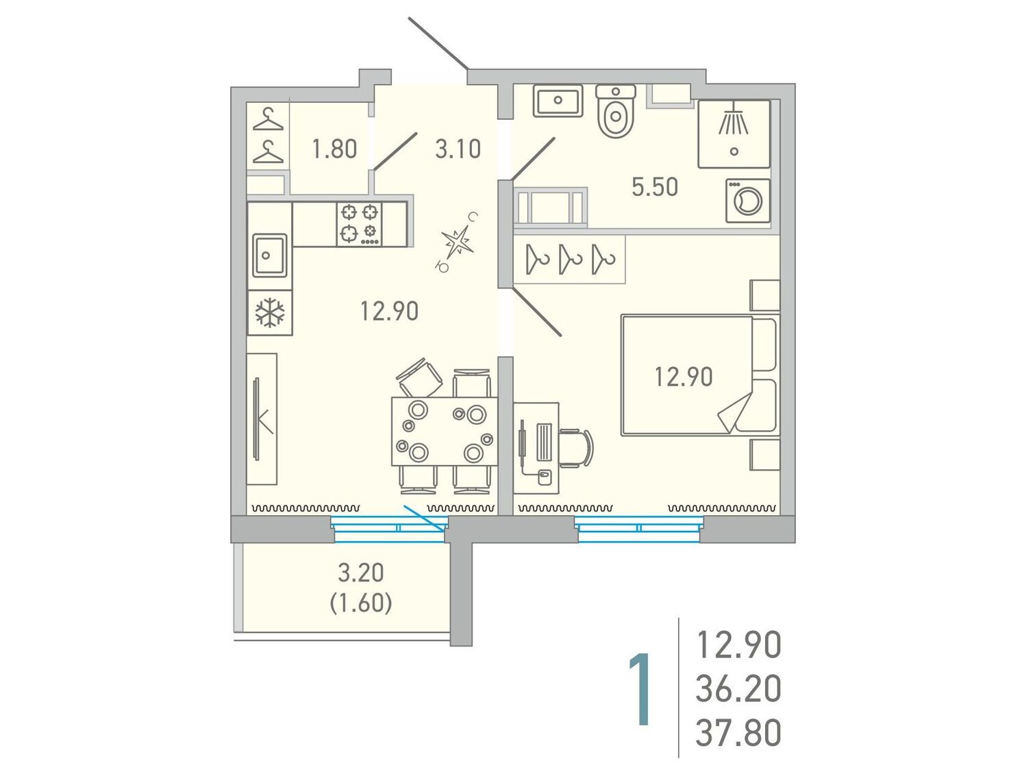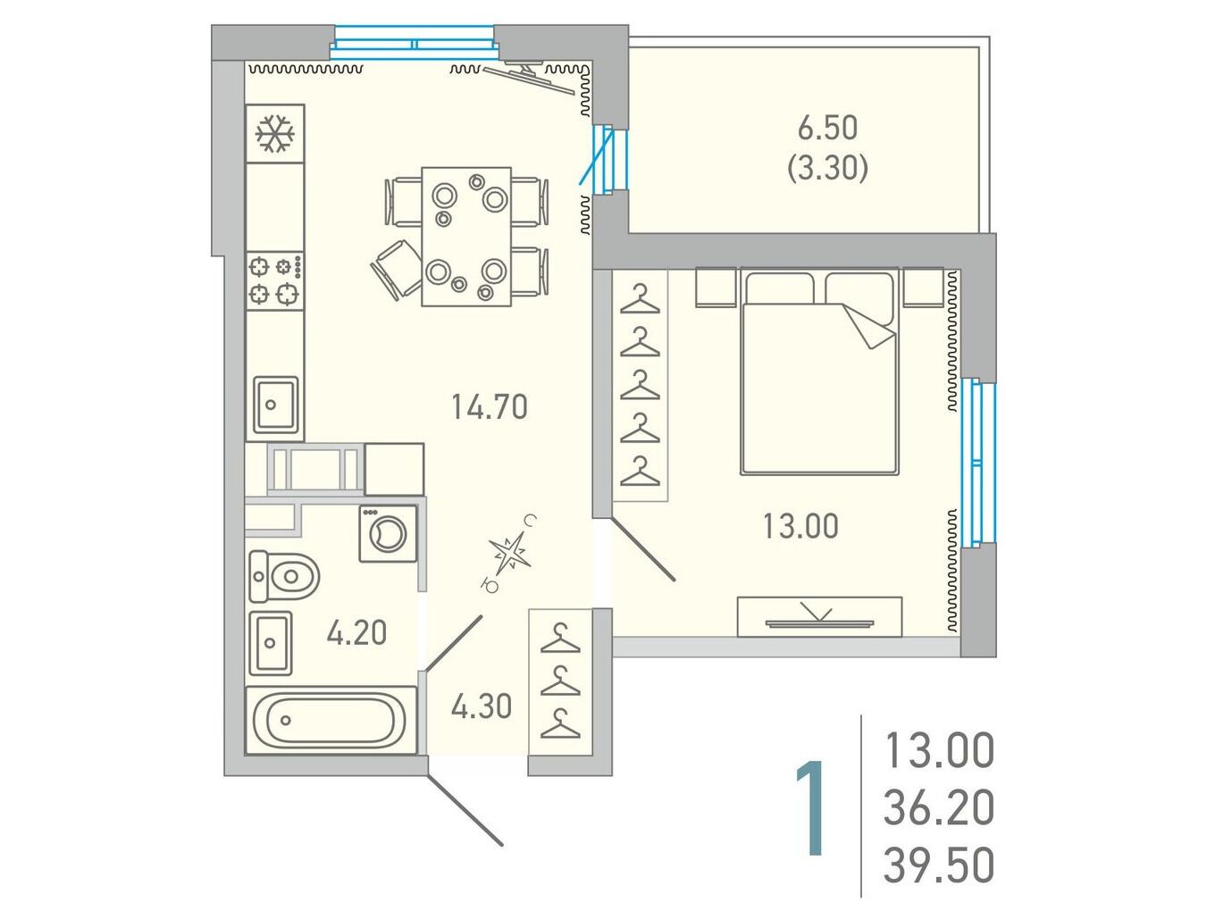 1-комнатная, 39.50 м²