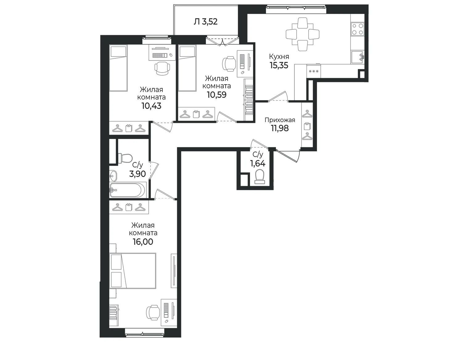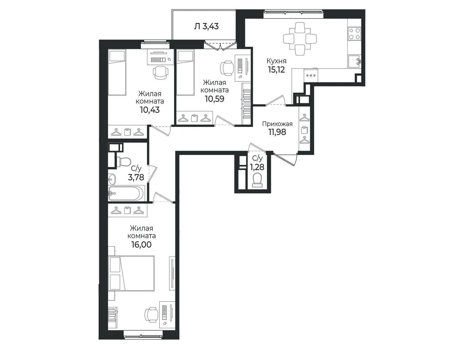 3-комнатная квартира, 80.52 м², 1 из 6 эт.
