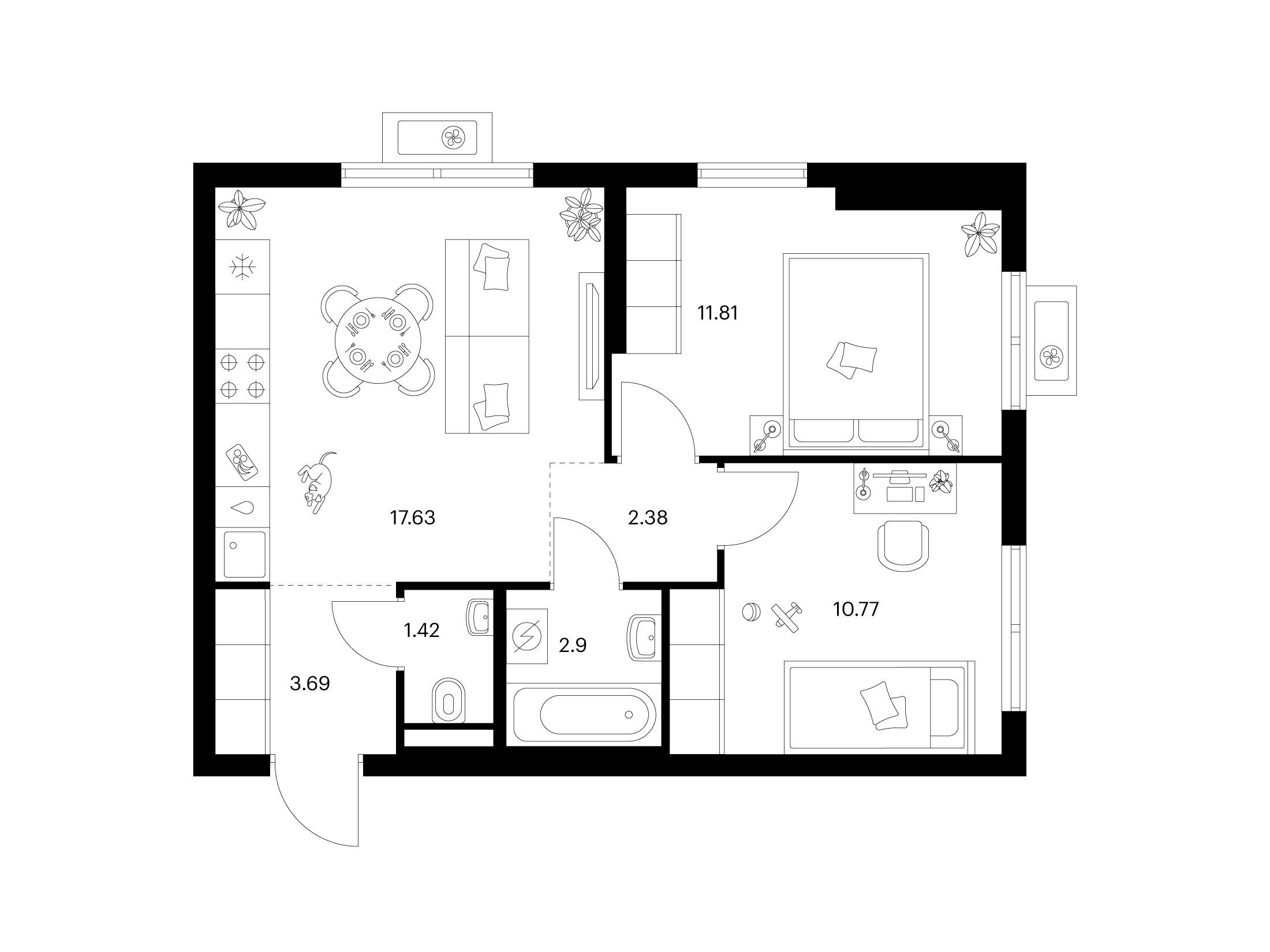 2-комнатная, 51.54 м²