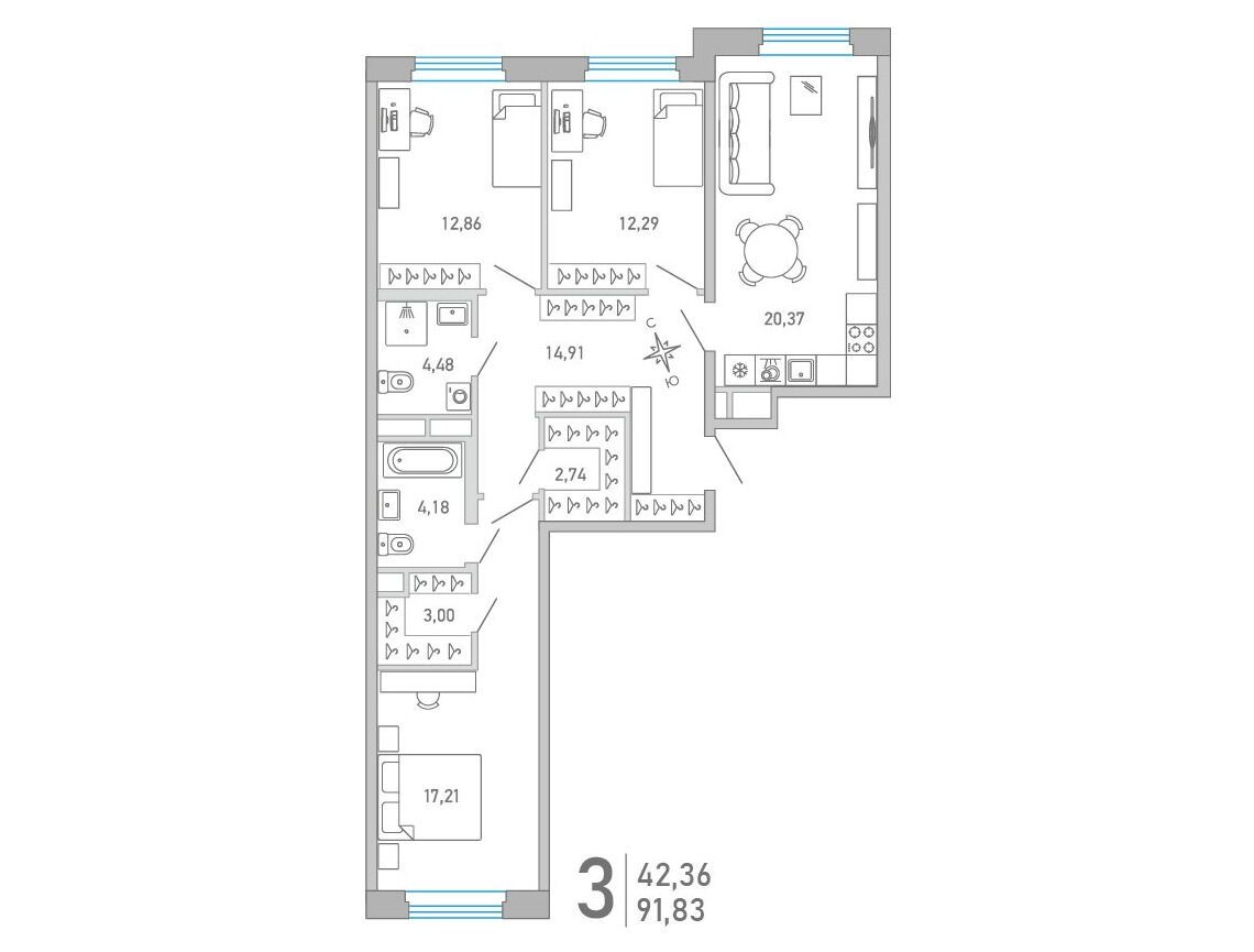 3-комнатная квартира, 84.59 м², 7 из 10 эт.