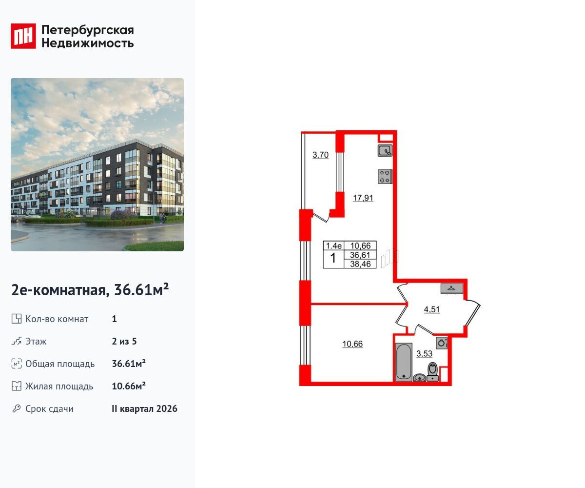 1-комнатная, 35.73 м²