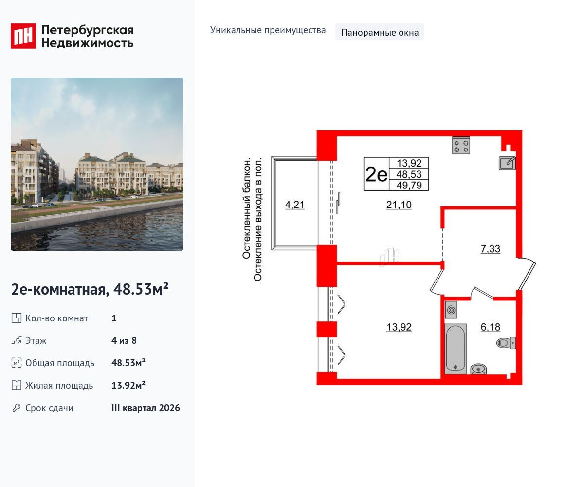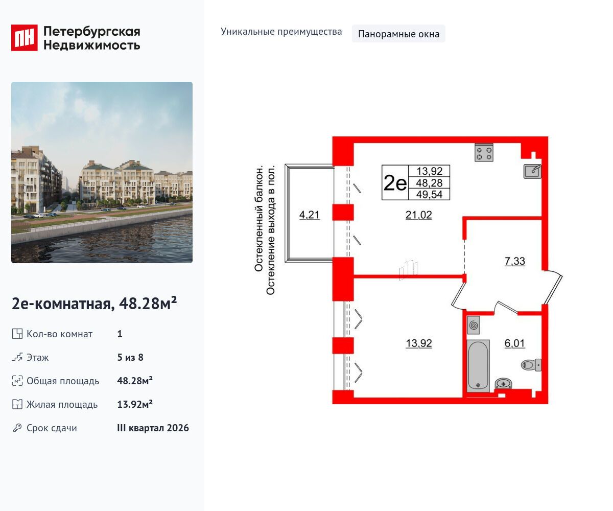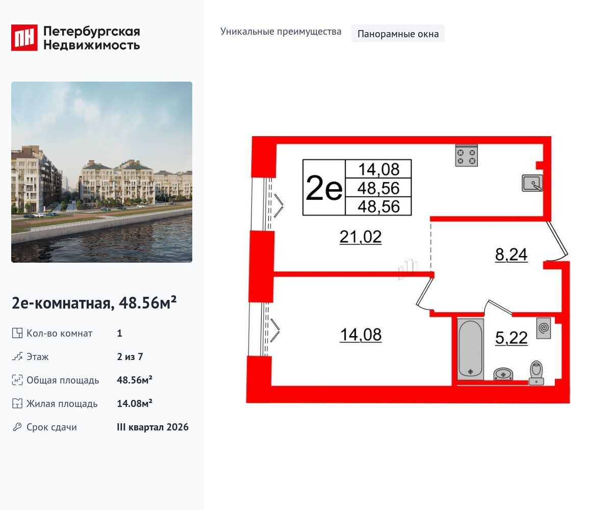 1-комнатная квартира, 44.84 м², 6 из 8 эт.