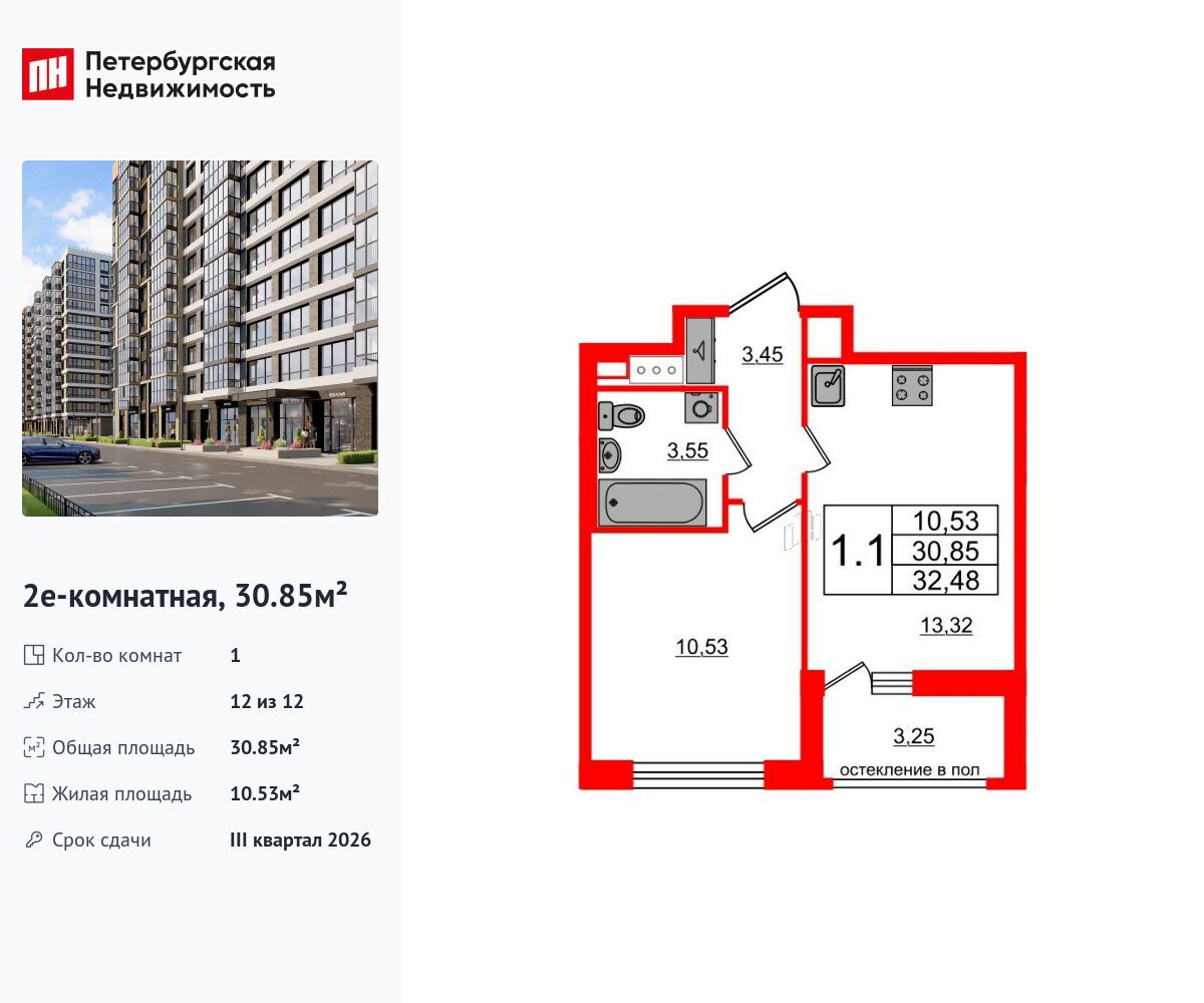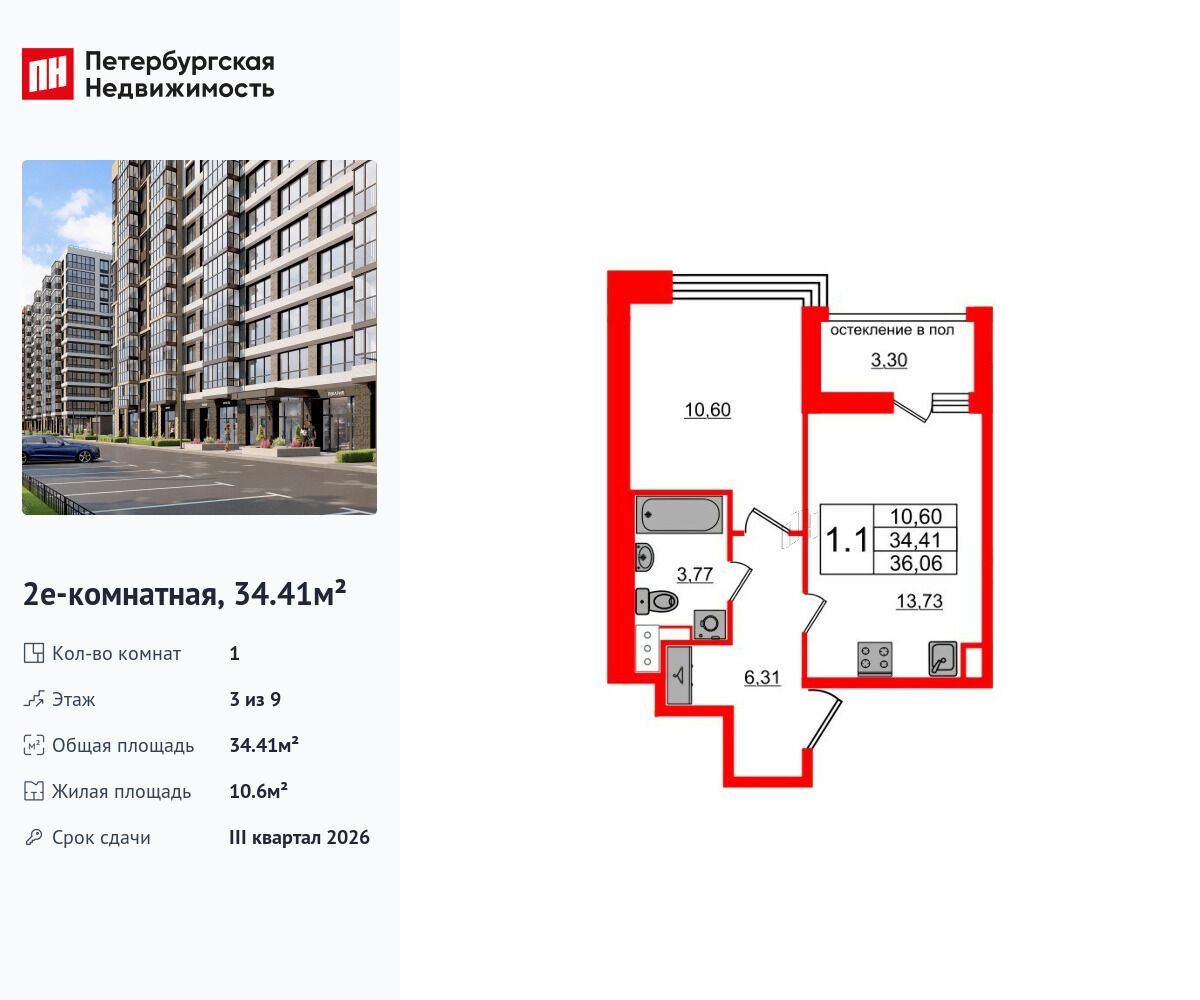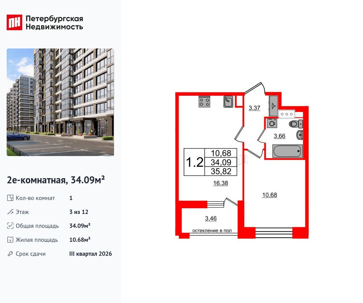 1-комнатная квартира, 34.66 м², 9 из 12 эт.