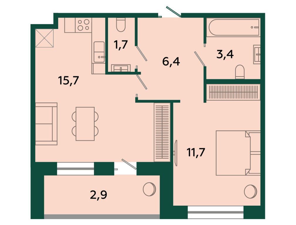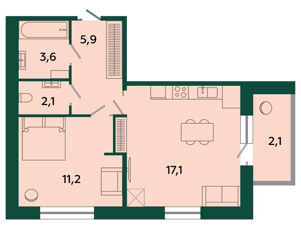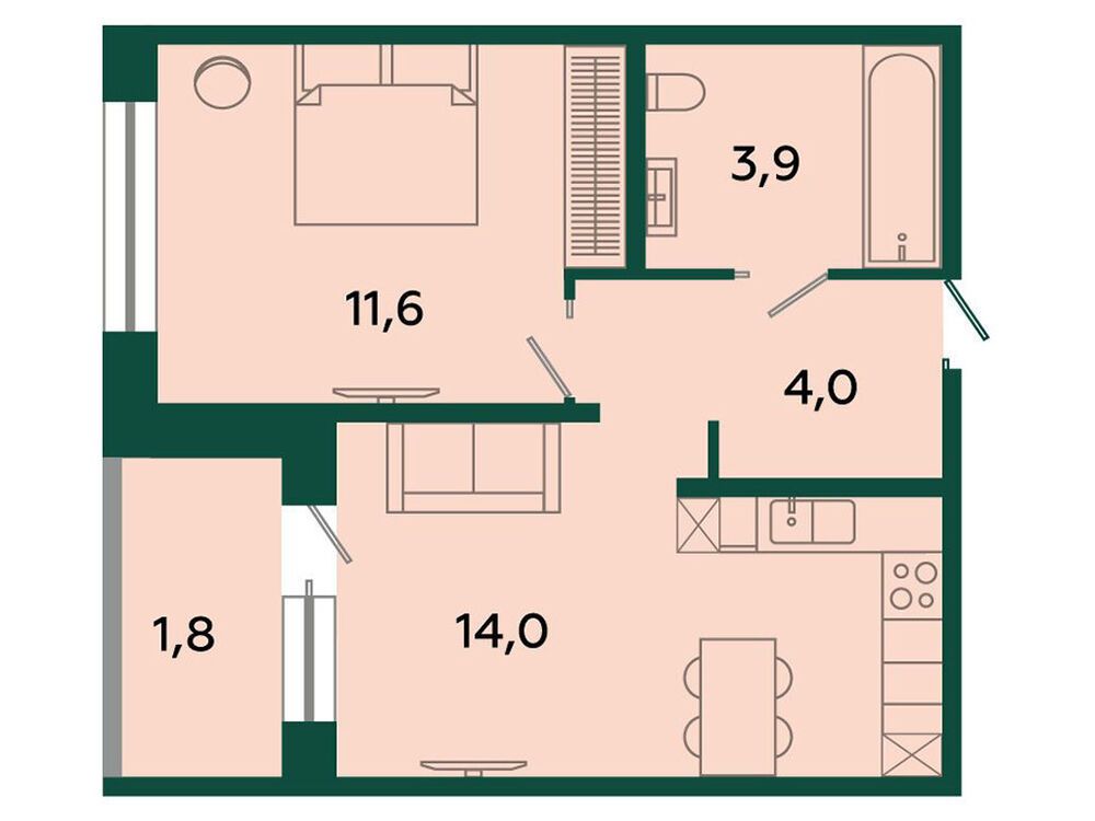 1-комнатная, 41.60 м²