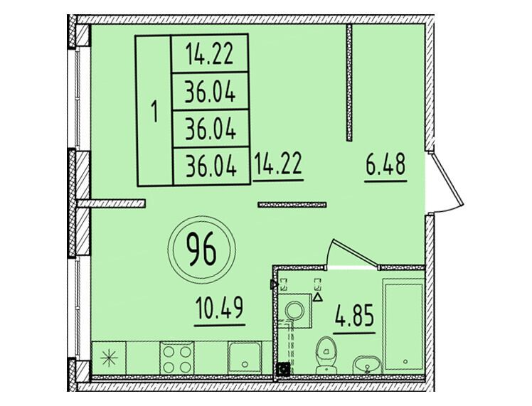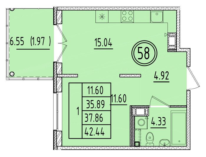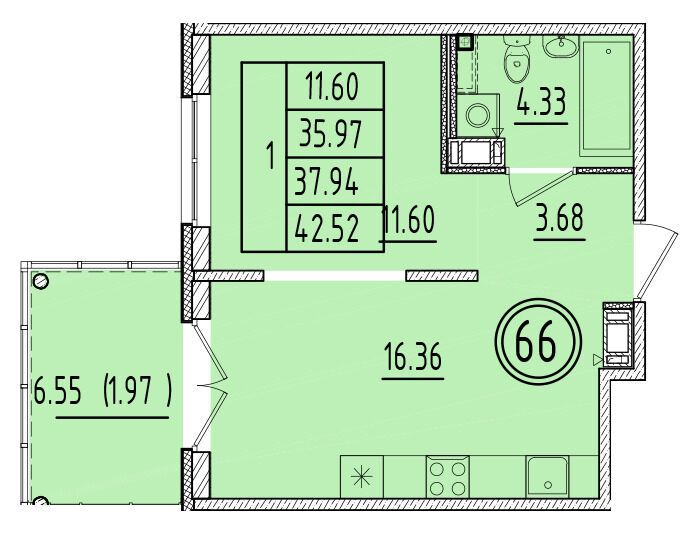 1-комнатная, 37.91 м²