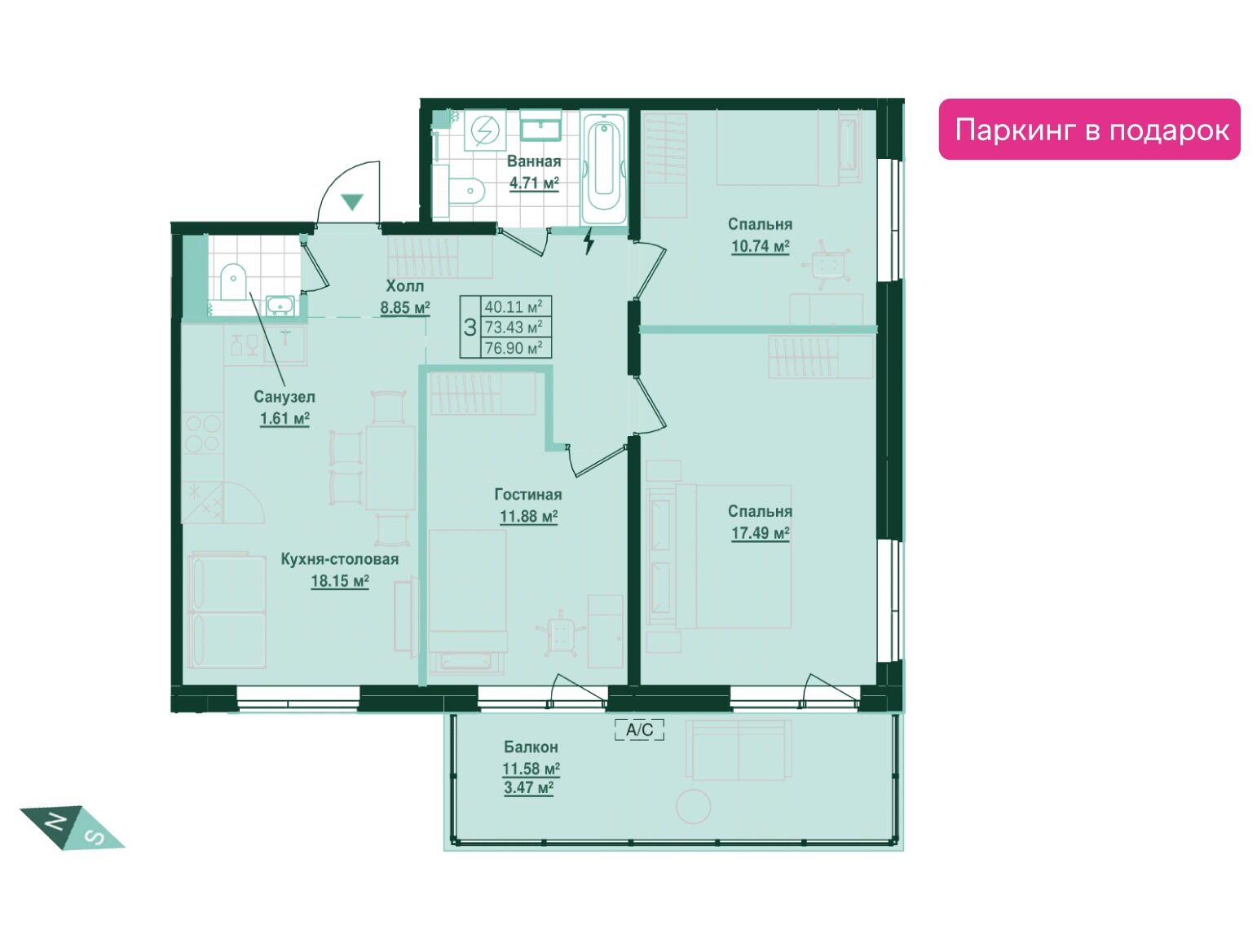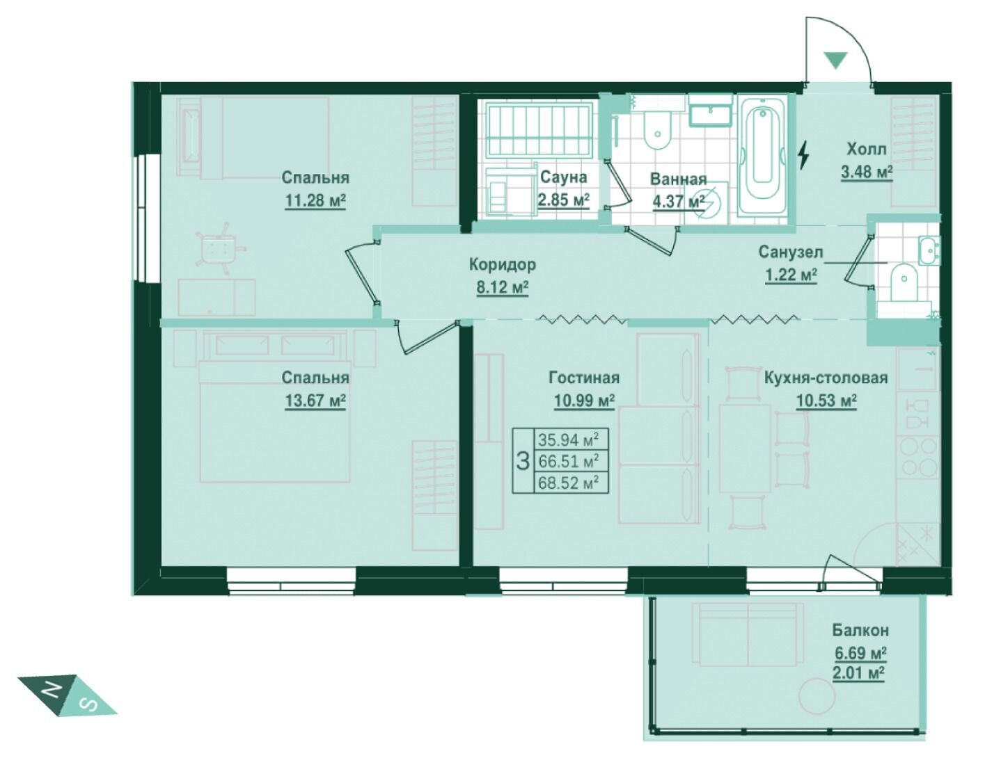 3-комнатная квартира, 68.52 м², 4 из 6 эт.