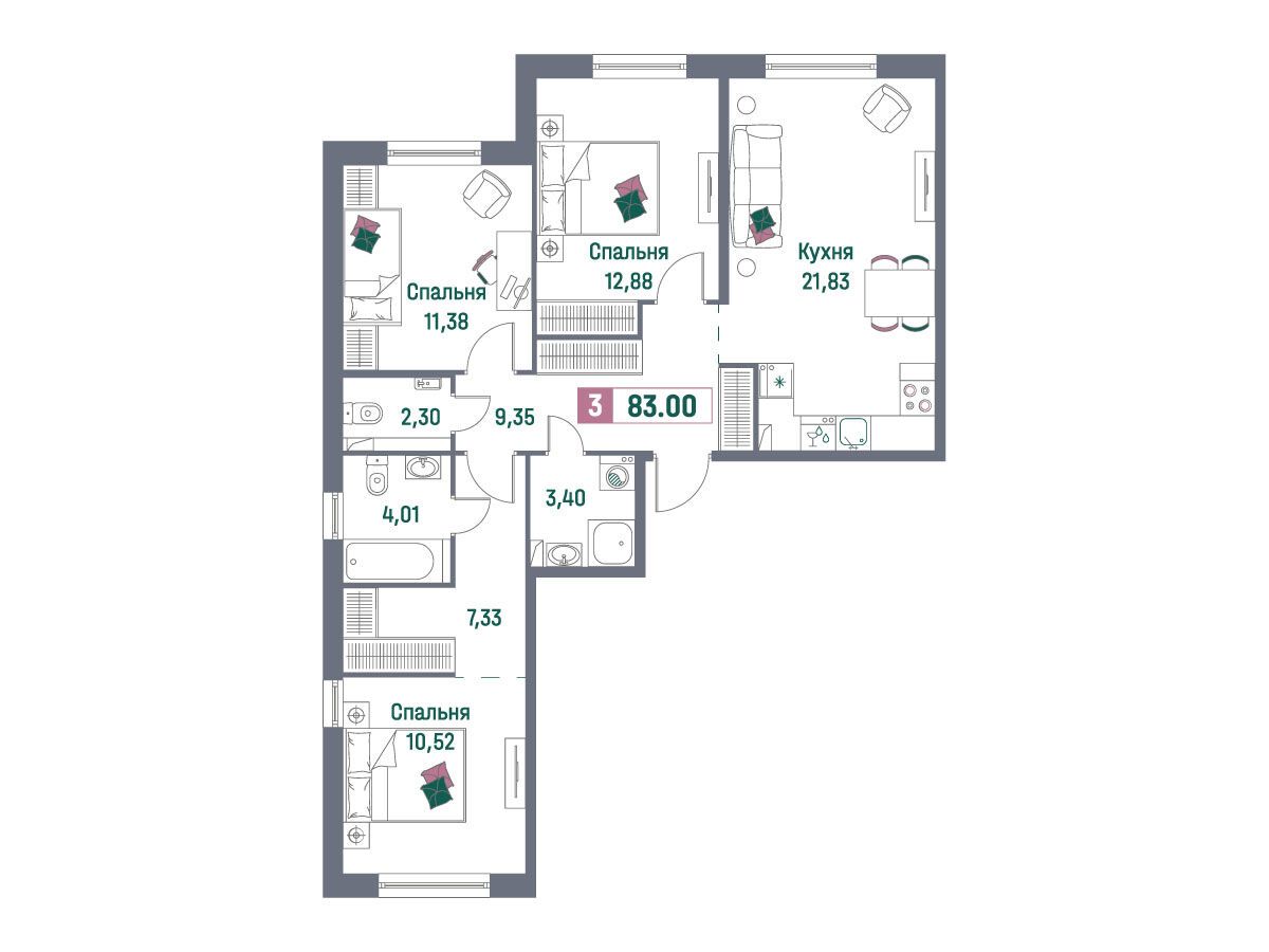 3-комнатная квартира, 87.62 м², 2 из 16 эт.