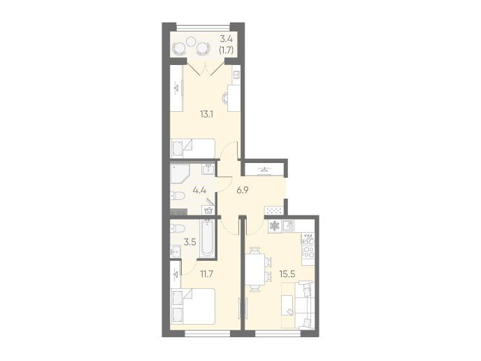 2-комнатная, 56.70 м²
