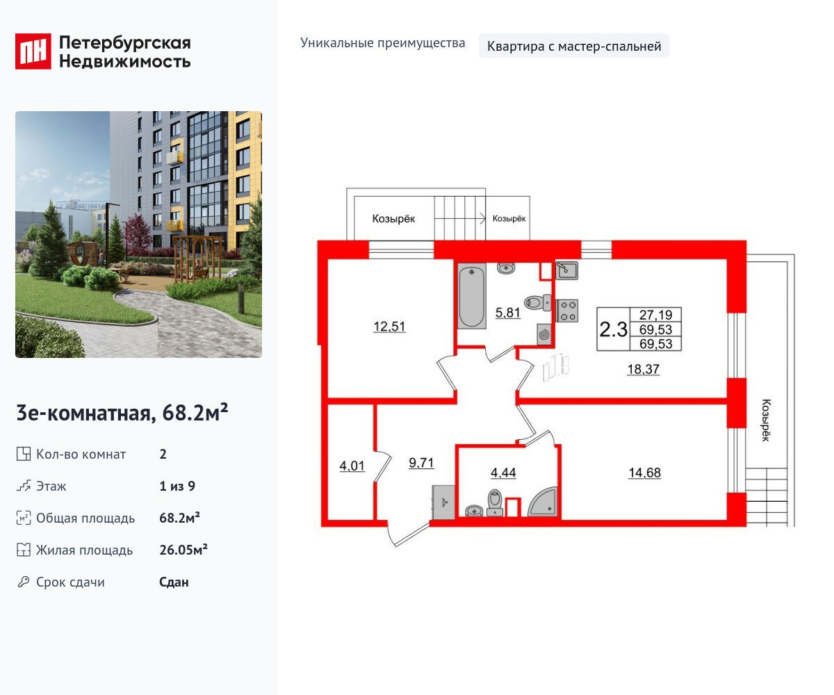 2-комнатная квартира, 68.20 м², 1 из 12 эт.