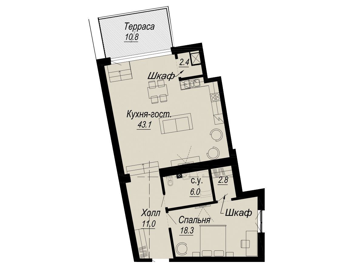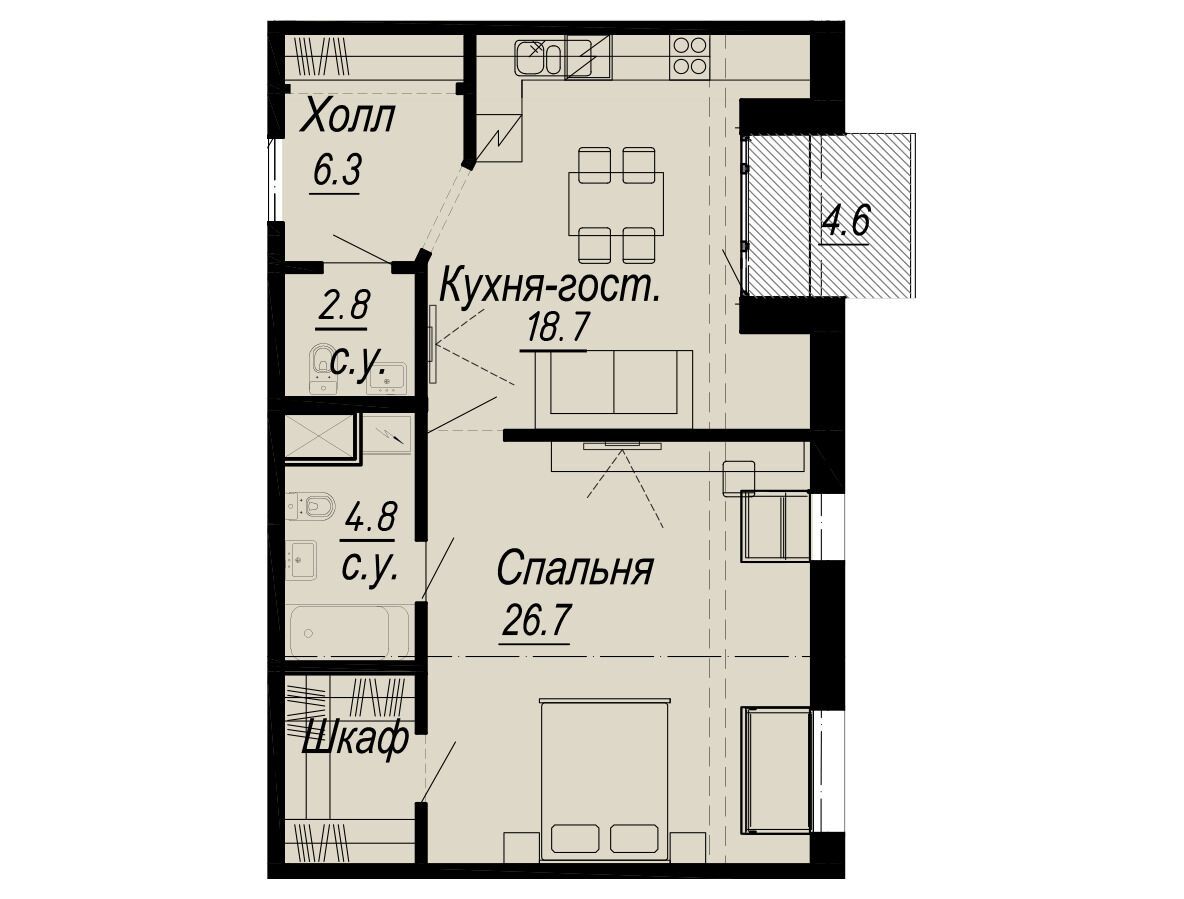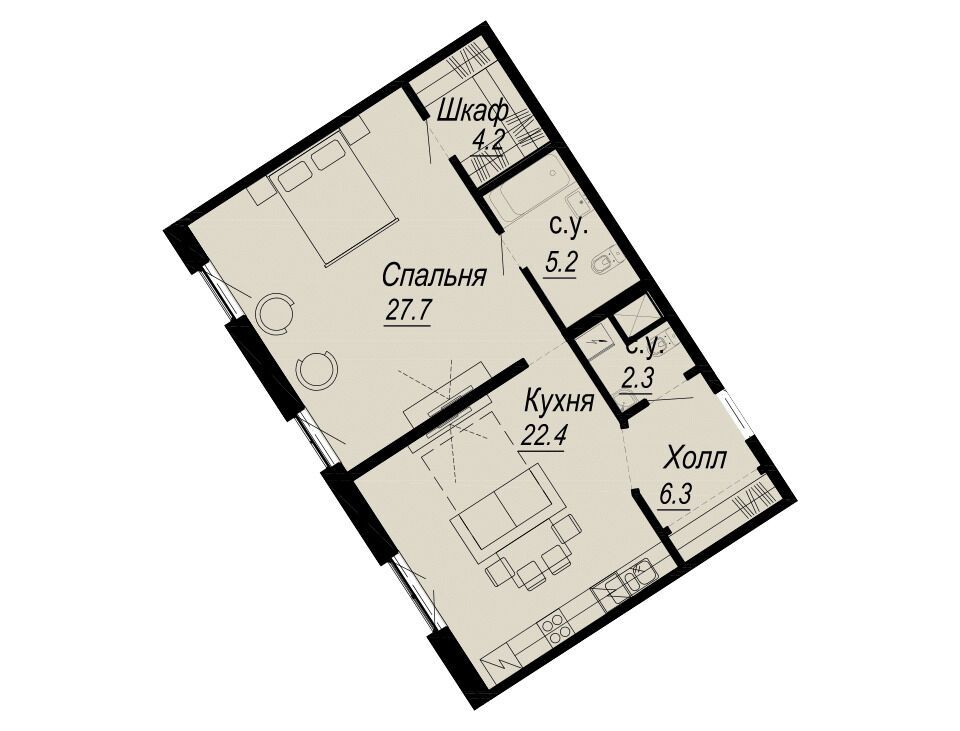 1-комнатная квартира, 68.00 м², 3 из 8 эт.