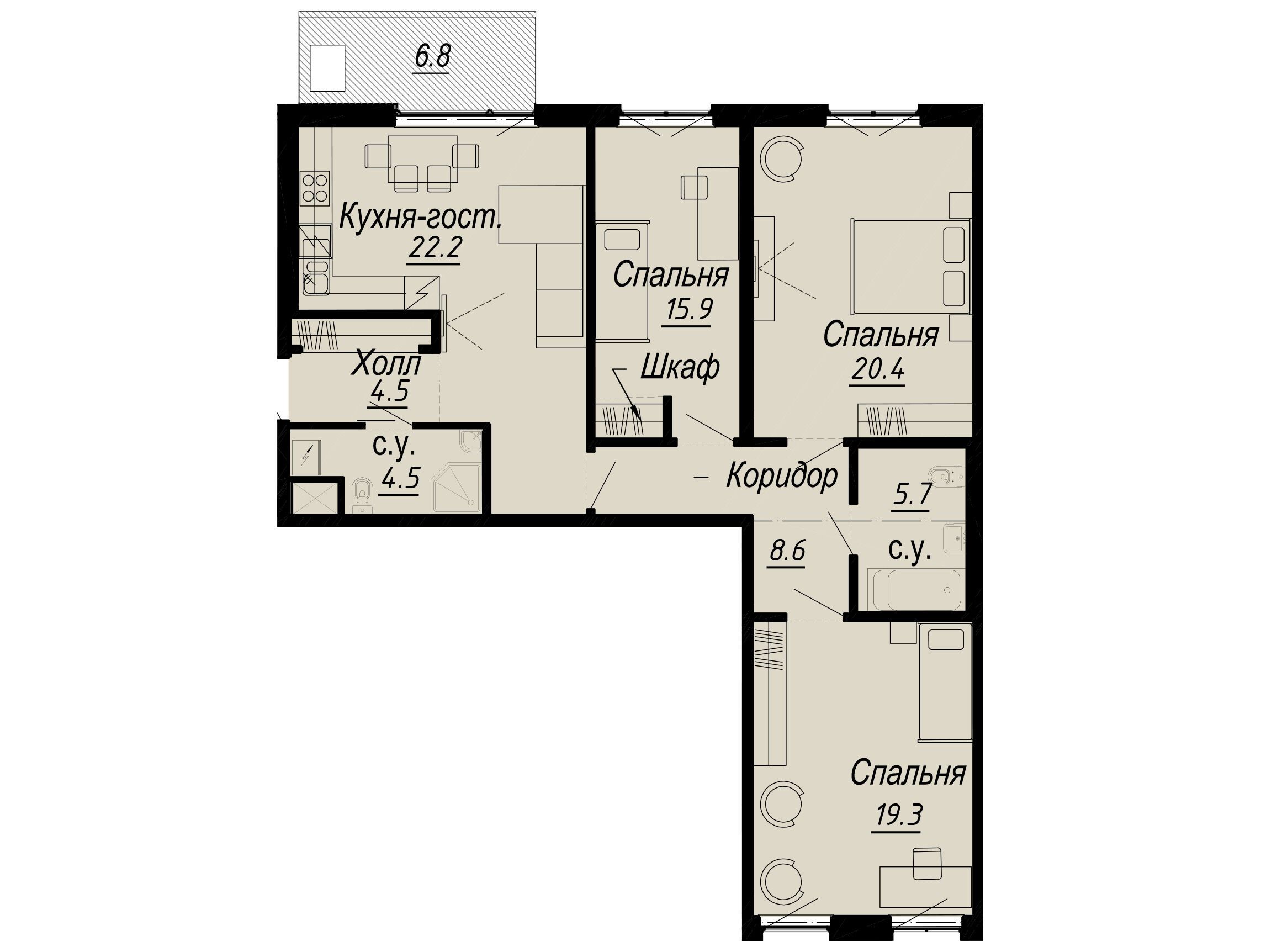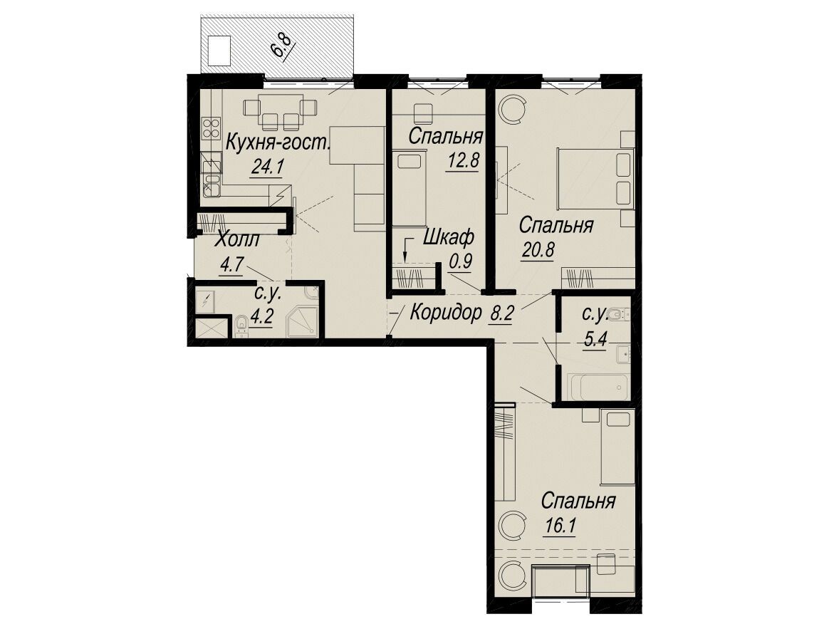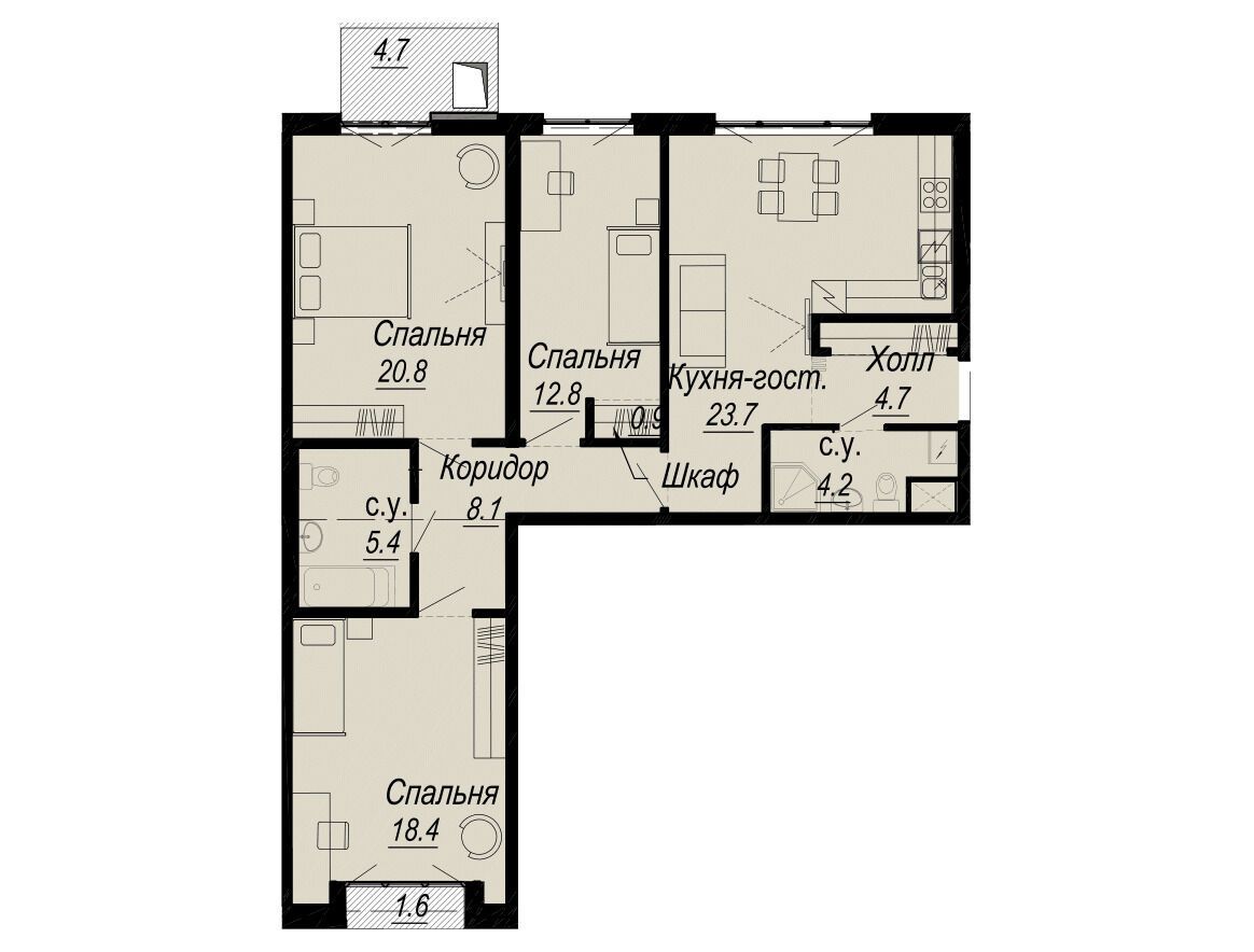 3-комнатная квартира, 102.00 м², 3 из 8 эт.