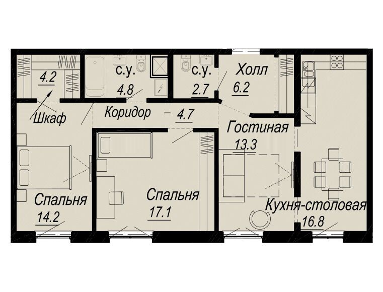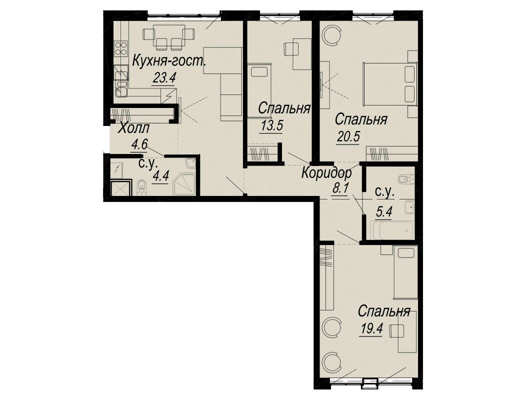 3-комнатная квартира, 107.60 м², 4 из 8 эт.