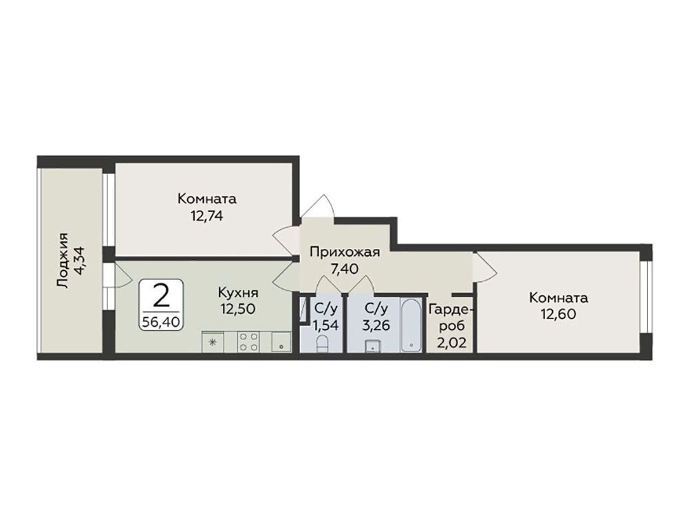 2-комнатная, 51.21 м²