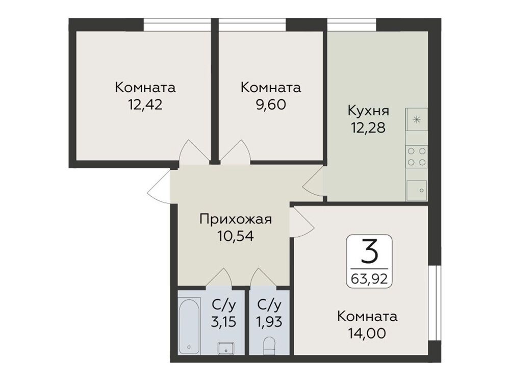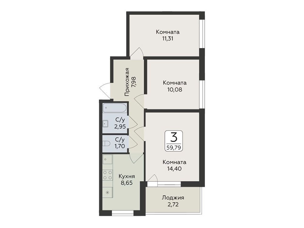 3-комнатная, 66.44 м²