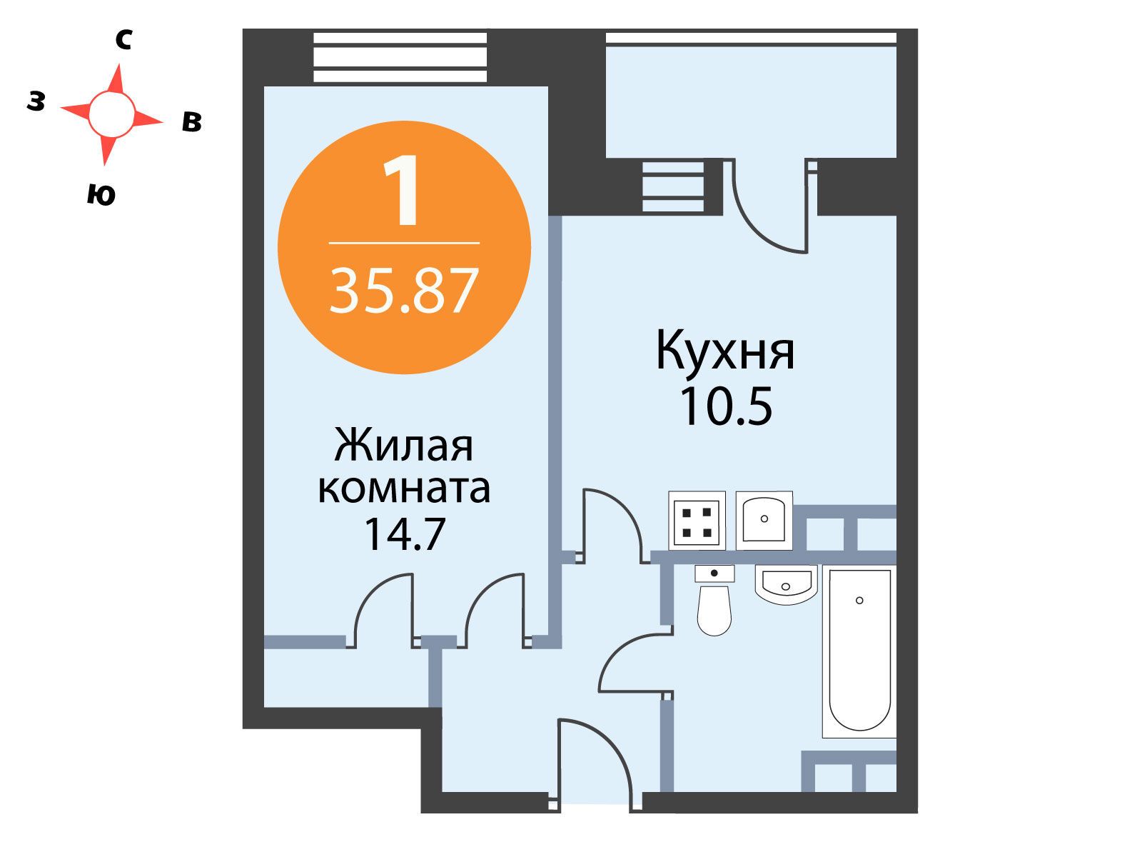 1-комнатная квартира, 35.96 м², 1 из 28 эт.
